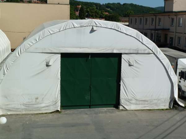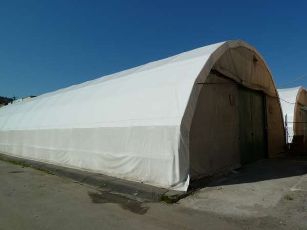 Gumotextilní hala 360 m2 - nevytápěný sklad 12x30 m s gumotextilní tkaninou na ocelové konstrukci, podlaha betonová.